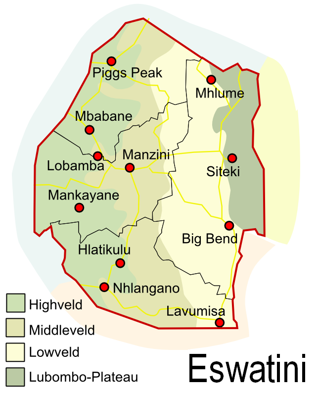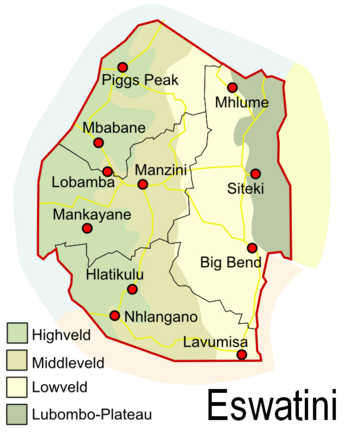 Vier Landschaftszonen prägen das Land von Westen nach Osten. Im Westen liegt das Hochland, auch Highveld genannt. Dieses erreicht etwa eine mittlere Höhe von 1300 Metern. Der höchste Berg Eswatinis heißt Emlembe und ist 1862 Meter hoch. Er liegt im Nordwesten. Dort wächst Regenwald.