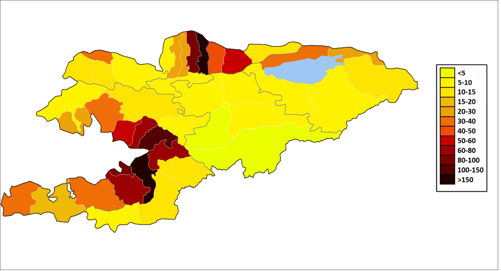 Der größte Teil der Bevölkerung von Kirgistan lebt in den großen Tälern des Landes: im Norden im Tal des Tschüi, das nördlich von Bischkek verläuft, und im Ferghanatal im Südwesten. Diese Verteilung kann man auch gut auf der Karte zur Bevölkerungsdichte sehen.
