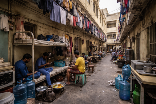 Diese Arbeiter*innen wohnen oft nicht in großen Häusern, sondern in engerem Wohnraum wie kleinen Apartments oder Sammelunterkünften. Manchmal sind viele Menschen zusammen in einem Gebäude oder in einem großen Haus untergebracht, das nur aus Wohnräumen für Arbeiter besteht. In einigen Fällen gab es Probleme mit Überfüllung und fehlender Sicherheit, was bei einem Brand 2024 in einem Wohnhaus in Mangaf tragisch deutlich wurde. Bei diesem Brand kamen viele Arbeiter ums Leben.