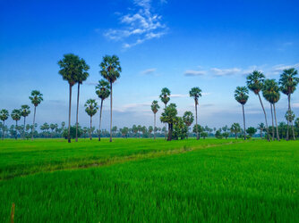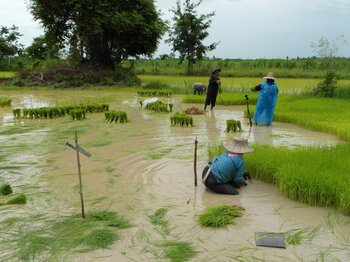Etwa die Hälfte der Menschen in Thailand lebt auf dem Land. Viele wohnen in kleinen Dörfern. Dort arbeiten zahlreiche Familien als Bauern. Sie bauen zum Beispiel Reis, Zuckerrohr, Mais, Kautschuk, Obst und Gemüse an.