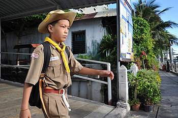 In Thailand gibt es an vielen Schulen eine besondere Tradition: Pfadfinderunterricht. Viele Kinder sind Mitglieder der Schulpfadfinder. Einmal in der Woche kommen die Schülerinnen und Schüler in Pfadfinderuniform zur Schule. An diesem Tag steht oft nicht der normale Unterricht im Mittelpunkt. Stattdessen lernen die Kinder Dinge, die auch Pfadfinder in anderen Ländern lernen: zum Beispiel Teamarbeit, Orientierung in der Natur, Disziplin und Verantwortung.