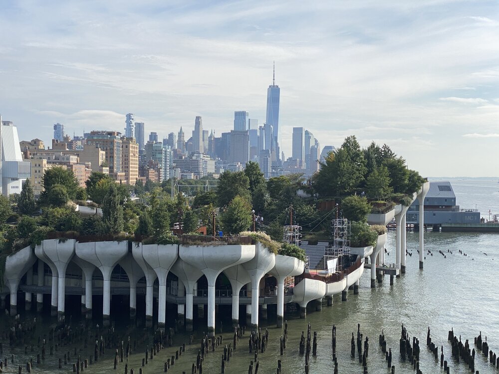 Sehr schön für eine Erholungspause zwischendurch ist Little Island. Das ist ein Park über dem Hudson River, der auf großen Betonstützen errichtet wurde, die wie Tulpen aussehen. Darauf wurde eine künstliche Insel mit Hügeln, Wegen, Bäumen und Blumen gebaut. Man kann hier entspannen, spazierengehen und etwas essen oder trinken. Der Park befindet sich am Pier 55. Und das Schöne: Der Zutritt ist kostenlos.