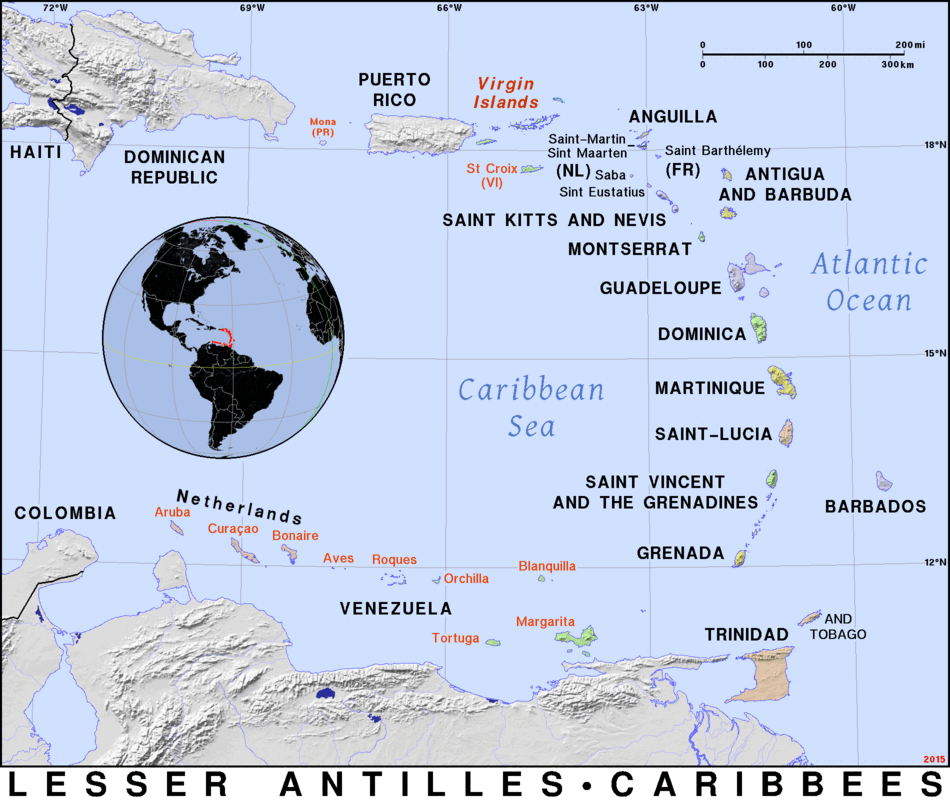 Die Kleinen Antillen erstrecken sich in der Form des Buchstaben J, wie man auf der Karte unten rechts gut erkennen kann. Eine Reihe von Inseln liegen fast in einer Reihe von Nord nach Süd, weitere im Südwesten von ihnen vor der Küste von Venezuela, also vor Südamerika. Man spricht auch von einer Inselkette, denn die Inseln liegen wie an einer Schnur aufgezogen.